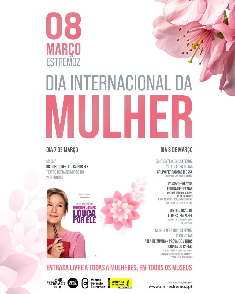 Já no dia 8 de março, as celebrações iniciam-se em frente à Câmara Municipal de Estremoz, a partir das 11h com o Grupo Ferranhas d’Ossa (Grupo de Cantares Feminino), após esta atuação será dado espaço para a iniciativa “Passa-a-Palavra”, com leitura de poemas de Poetisas ou alusivos ao Dia da Mulher (Maria Toureiro e Sofia Soares Ribeiro, do Coletivo Cultura Alentejo) e para finalizar a manhã, haverá ainda a distribuição de flores, em papel, realizadas pelos alunos da Academia Sénior de Estremoz.