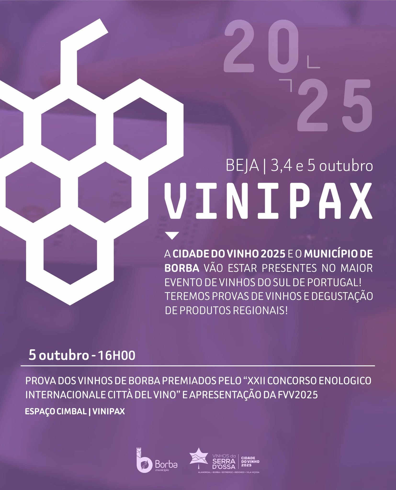 Nos dias 3, 4 e 5 de outubro, Borba vai estar representada na VINIPAX 2025, em Beja, enquanto “Cidade do Vinho 2025”, a convite da Câmara Municipal de Beja.