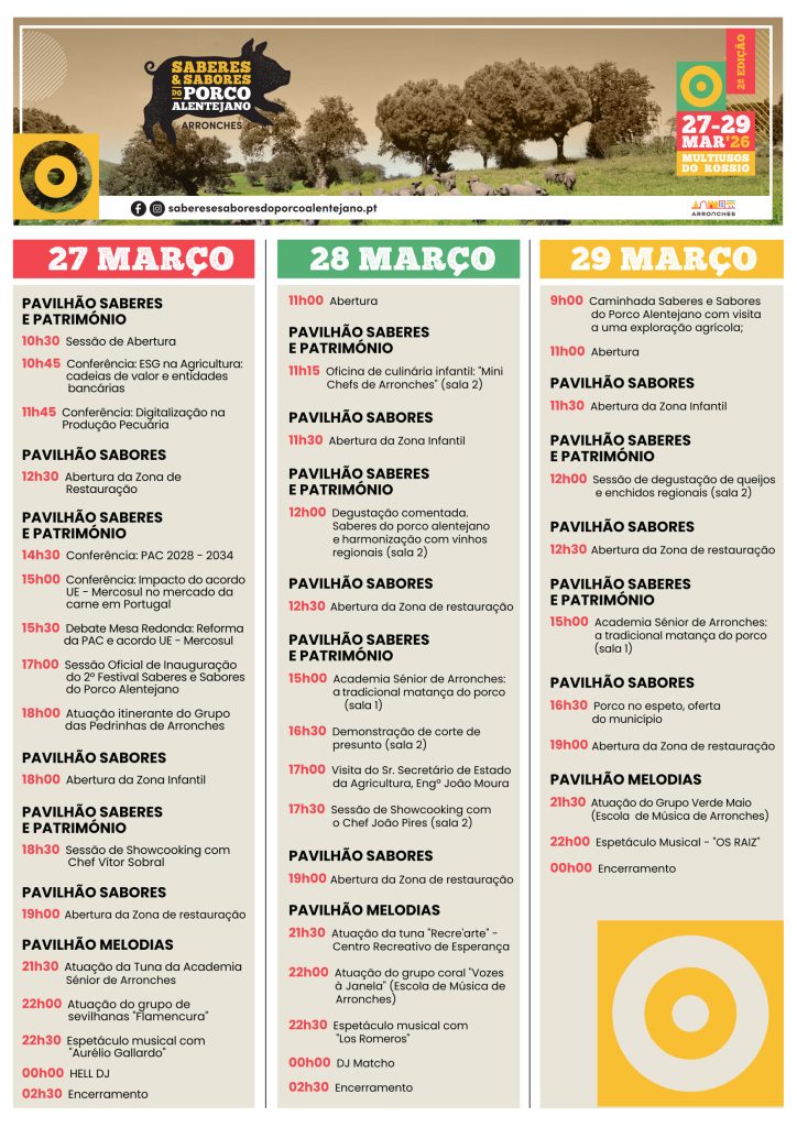 Arronches recebe, de 27 a 29 de março, a 2.ª edição do Festival “Saberes e Sabores do Porco Alentejano”, um evento que celebra uma das mais importantes tradições gastronómicas e culturais da região.